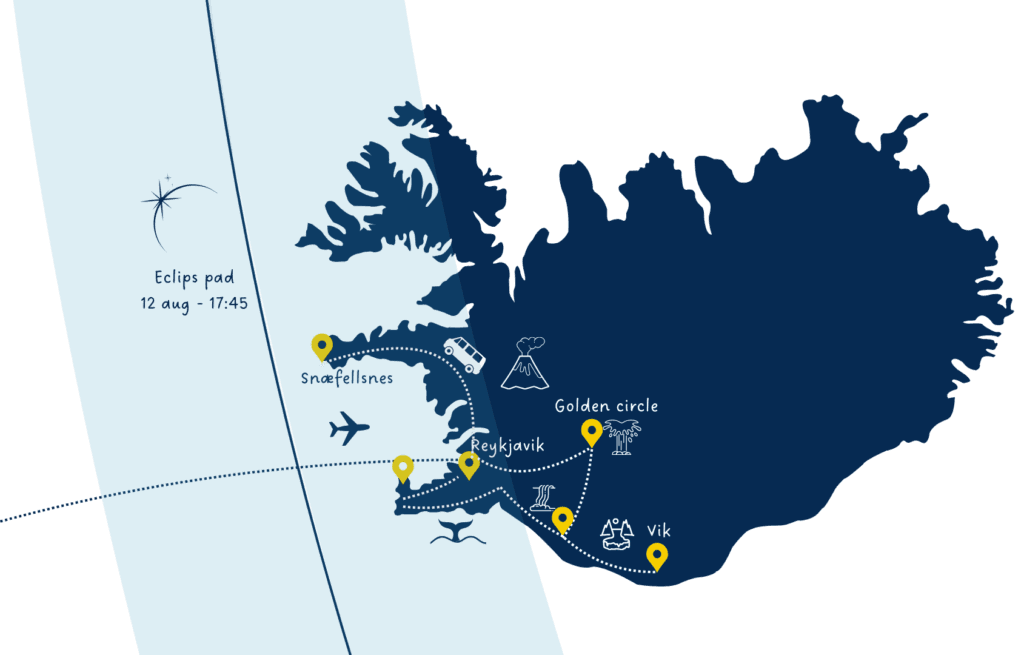 Op 12 augustus 2026 beleven we de totale zonsverduistering op het schiereiland Snæfellsnes. We bevinden ons binnen het pad van totaliteit, waar de eclips ruim twee minuten volledig zichtbaar is.