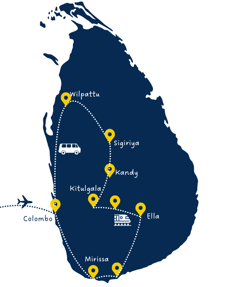 Beklim de beroemde Leeuwenrots van Sigiriya, reis per trein door de groene theevelden van Ella, spot wilde olifanten in een nationaal park en sluit af met relaxen aan de kust.