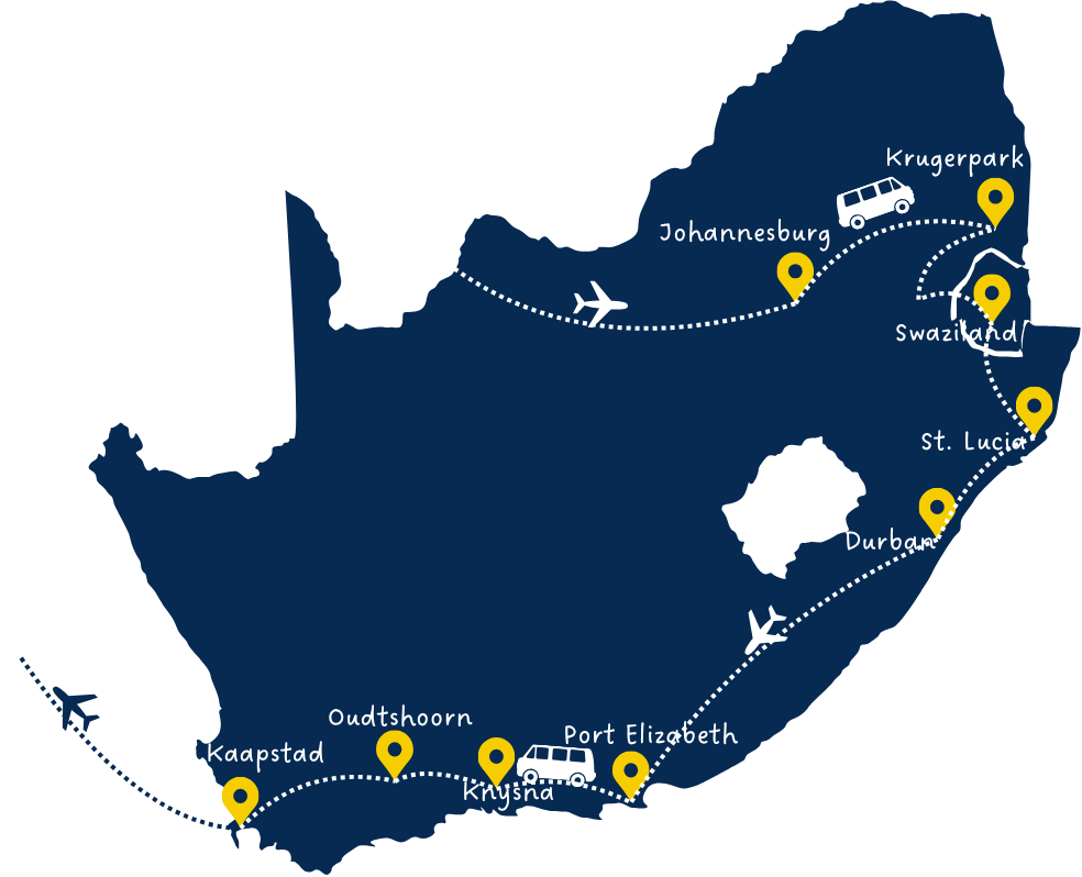 • Tijdens de reis is er een rechtstreekse binnenlandse vlucht van Durban Airport (DUR) naar Port Elizabeth Airport (PLZ)